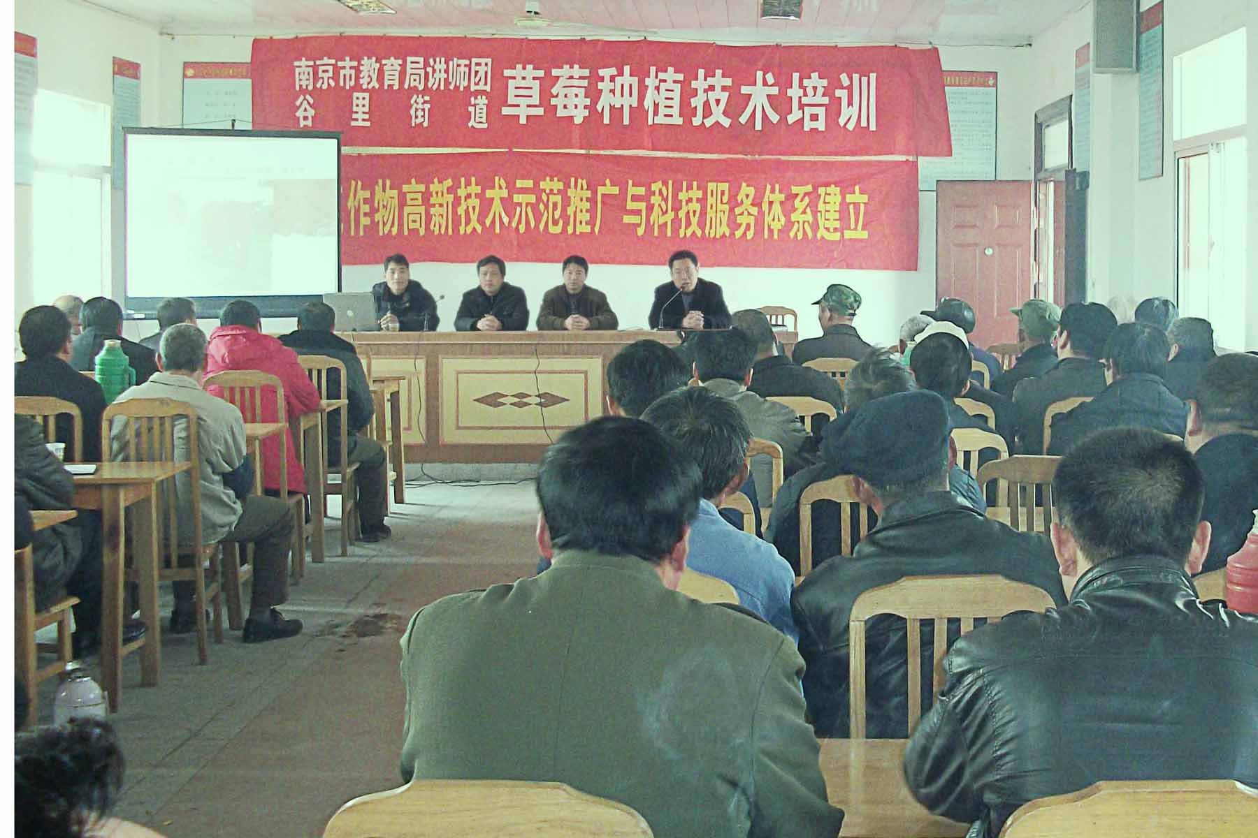 3月10日上午谷里街道向阳社区大会议室坐满了前来参加培训的草莓种植专业户和有志加入草莓种植的谷里市民,共计100人。主讲人是南京市教育局讲师团、金陵科技学院张长青教授。
