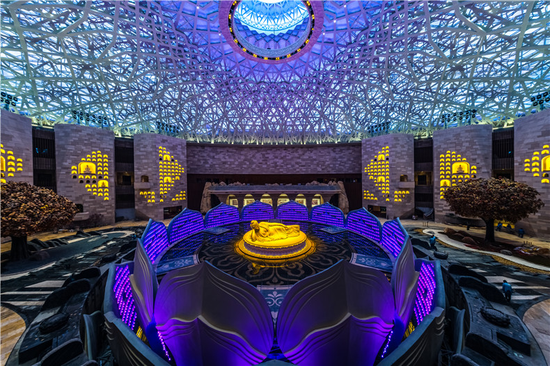 南北长112米,东西宽62米,内部净高约41.2米,涵盖了地上三层。整个空间面积超过6000㎡,呈椭圆形,以黄、白、灰三色为基调,布置出人间山水,从而让人们在行走之际领略禅意。由佛陀出生、成道的禅境花园及中间的如莲剧场三个部分组成,展现了佛祖一生的行迹。