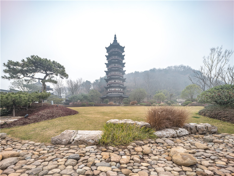 佛顶塔是佛顶圣境的标志性建筑之一,建筑高度约88米,建筑面积5065平方米,九级四面,与明代弘觉寺塔相为呼应,重现历史上牛首山“双塔”的恢弘格局。塔内供奉一尊毗卢遮那佛坐像,置有一口仿唐式全铜铸金刚钟,还有各种经藏展示。整个佛顶塔造型宏伟,尽显唐风古韵,登塔望远,可尽收牛首山四季美景。