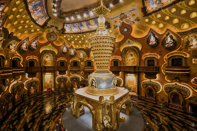 千佛殿依照金刚界曼荼罗第四供养会设计而成,整座大殿共有佛、菩萨1343尊,再现了佛与菩萨相互供养的神圣场景。其中,大殿正中为象征大日如来的舍利大塔,大塔的东南西北四个方向为四方佛(东方阿閦佛、南方宝生佛、西方阿弥陀佛、北方不空成就佛),大殿墙壁上为慧门十六尊、八内外供养等菩萨。